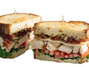 Grilled Chicken breast, slices of turkey Bacon, shredded lettuce , thin slices of tomatoes, light mayo & drizzle of chipotle aioli on traditional sourdough bread.